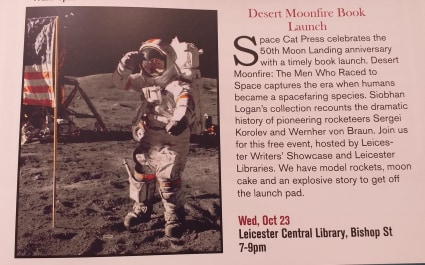 Desert Moonfire Book Launch. 23rd October, 7-9pm. Our book launch will be hosted by Leicester Writers’ Showcase and Leicester Libraries. It will be a free event suitable for 14+ years. We will have model rockets, moon cake, and an explosive story to get off the launch pad!