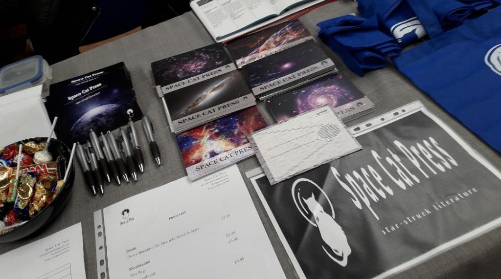 Happily, this is the site of Space Cat Press’ autumn series of launch events, all supported by Leicester’s Everybody’s Reading festival and #DMULocal. So this weekend, at Leicester Writers’ Bookfair, we unveiled our first bookstall, laden with books, rockets, space-bags, poemcards and cosmic sweets. A galaxy of goodies for space lovers and bookworms alike.