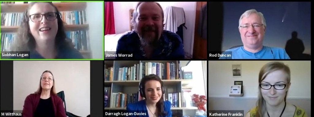 We then asked four of our contributors to come aboard on the day and join us for a livestreamed Zoom meeting. These were Katherine Franklin (Pathfinder), Rod Duncan (On the Path of Comets), James Worrad (+1) and Michele Witthaus (‘Visible spectrum’).