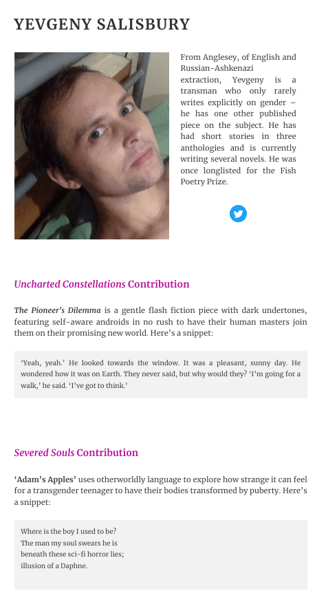 In this space-themed anthology, twenty writers take the last Space Race as a launch pad to propel us far into the future. Uncharted Constellations crosses genres from dark science fiction to lyrical poetry, via twists of flash fiction and fragments of memoir. And between the strangeness of space and the loneliness of long-distance missions, you will find the human heart refracted in a myriad of ways.