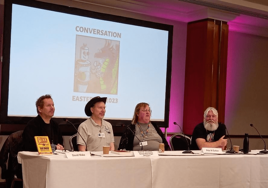 Two weeks on, we are still looping around the glorious constellation that was the annual British National Science Fiction Convention. Our first ever Eastercon was everything you’d hope for – the welcoming friendly vibe, the costumes, the spellbinding art and crafts, the hubbub of fans and creatives, writers, readers, booksellers. The passion for storytelling and style. Eastercon 23 was themed Conversation and there was plenty of that going on in every corner, including the online Discord hub. I was really impressed with Eastercon’s commitment to providing a fully hybrid convention with digital social gatherings as well as live-streamed panels. Meanwhile, on the Hilton Metropole hotel site, the volunteers team had thought of everything from food trucks to quiet rooms to daily bulletins. We were like a self-contained spaceship spinning in our own giddy orbit for that mad Easter weekend.